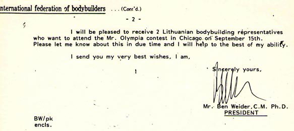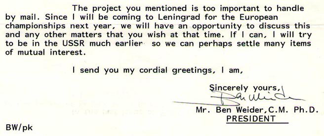 Tačiau, BENAS VEIDERIS, jau turėdamas sėkmingą prekybinę rinką SSSR, dėl Lietuvos savarankiško stojimo į tarptautinę IFBB federaciją bijodamas Maskvos nemalonės, atsisakė palaikyti lietuvių siekius. Komercinė nauda buvo svarbesnė. Niekam į galvą negalėjo ateiti, kad jau po kelių mėnesį Maskvoje įvyks „rugpjūčio pučas“ ir sena tvarka net sporte kardinaliai pasikeis (dokumentai yra saugomi Pasaulinės WFF-WBBF federacijos archyvuose, kai ką rasite Pasaulinės federacijos interneto puslapyje www.wff.lt) .