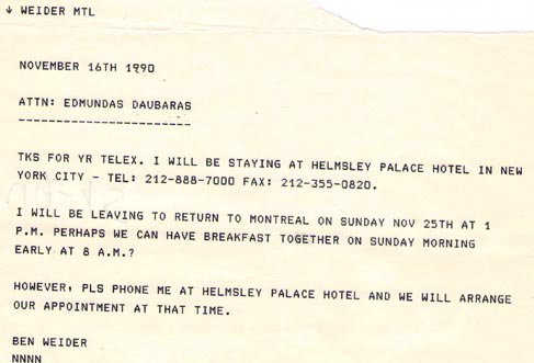 Pagaliau, santykiai tarp EDMUNDO DAUBARO ir BENO VEIDERIO pasiekė tikį lygmenį, kad kanadietis paprašė abiems svarbius klausimus toliau spręsti ne korespondencija, o asmeniniais susitikimais (žr. Beno Veiderio laiškus tarptautiniame interneto puslapyje www.wff.lt). Tuomet įvyko eilė abiejų bendrų susitikimų Rusijoje (Maskva, Leningradas), Prancūzijoje (Paryžius), Malaizijoje (Kuala Lampūras) ir JAV (Niujorkas). Visais atvejais EDMUNDAS DAUBARAS buvo asmeniniu BENO VEIDERIO svečiu, ką jis laiškuose pabrėždavo. Susitikimai buvo svarbūs abiems, dėl to BENAS VEIDERIS buvo pasiruošęs atidėti bet kokius kitus reikalus (žr. Beno Veiderio laiškus tarptautiniame interneto puslapyje www.wff.lt). E.DAUBARO ir BENO VEIDERIO santykių kulminacija buvo 1990 m. lapkričio 25 d. ketinimų protokolo dėl bendros įmonės steigimo pasirašymas Niujorko Helmsli (Helmsley) rūmuose (medžiaga Pasaulinės WFF-WBBF federacijos archyvuose).