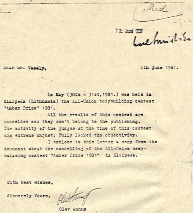 Neseniai VLADIMIRAS ŠUBOVAS, gyvenantis Vokietijoje, su Vokietijos nacionaline rinktine atvyko dalyvauti 2010 m. WFF-WBBF pasaulio čempionate (vyko Slovakijos Brusno Kupele kurorte). V.ŠUBOVAS, pasirodo, asmeniškai buvo Maskvoje vykusių politinių įvykių dalyvis ir papasakojo, kad OLEVO ANUSO pralaimėjimo klausimas Klaipėdoje sprendėsi aukščiausiu lygiu. Specialios tarnybos sužinojo, kas OLEVAS ANUSAS ruošiasi emigruoti į Suomiją. SSSR Goskomsportas gavo SSSR komunistų partijos centro komiteto atitinkamo skyriaus nurodymą neleisti estui laimėti „Gintarinio prizo“ turnyre. Toliau J.MOROZAS davė nurodymą R.KALINAUSKUI, o šis viską sutvarkė, kaip lieptas. Po turnyro OLEVAS ANUSAS bandė kovoti su neteisybe, rašė laiškus, tačiau tai nepadėjo.